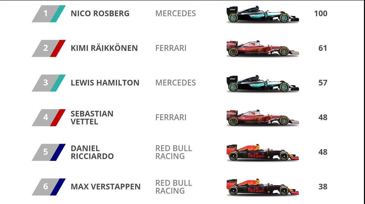 Mersut todennäkösesti vie 2 ensimmäistä sijaa, mutta 3. sijasta tulee mieletön taistelu jos Red Bull on jatkossakin näin hyvä. Monaco, Unkari ja Singapore näyttävät Red Bullille esim. aivan loistavilta jopa voittoa ajatellen.
