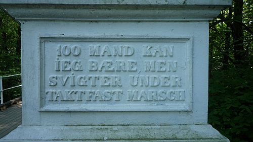 :thumbup: - hyvin käännetty. Kieli on tanskahtavaa tai muuten vanhaa. Teksti löytyy sillan molemmista päistä."Jaksan kannatella 100 ihmistä (miestä?), mutta sorrun tahtimarssista"?