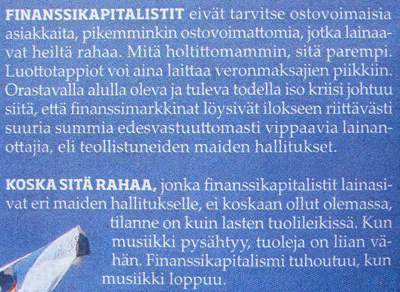 Tässähän se ongelma piileekin. Pankit lihottaa itsensä voitoilla mutta heti kun tulee senttiäkään tappiota niin valtio maksaa. Näin ei missään nimessä saa homma olla.Vapaassa markkinataloudessa sijoittajien vastuu olisi toteutunut ja pankit olisivat kärsineet tappiot. Nykyjärjestelmässä moraalikadon ongelma pahenee jatkuvasti, kun pankit voivat sijoittaa yhä suuremmilla riskeillä tietäen, että valtiot pelastavat ne verovaroin. Mitä kauemmin nykyistä linjaa jatketaan, sitä suurempi seuraavasta romahduksesta tulee.