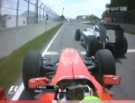 Tuossa ei jää kyllä mitään kysymysmerkkiä kumman vika oli. Schumi vaihtaa linjaansa kesken jarrutuksen. Ilman sitä olisi Massalle jäänyt riittävä rako jarrutukseen.. Ohi ei olisi mennyt mutta paremmat vauhdit olisi varmana saanut seuraavalle suoralle. Ja mahdollisesti ohittanut jos ja jos..