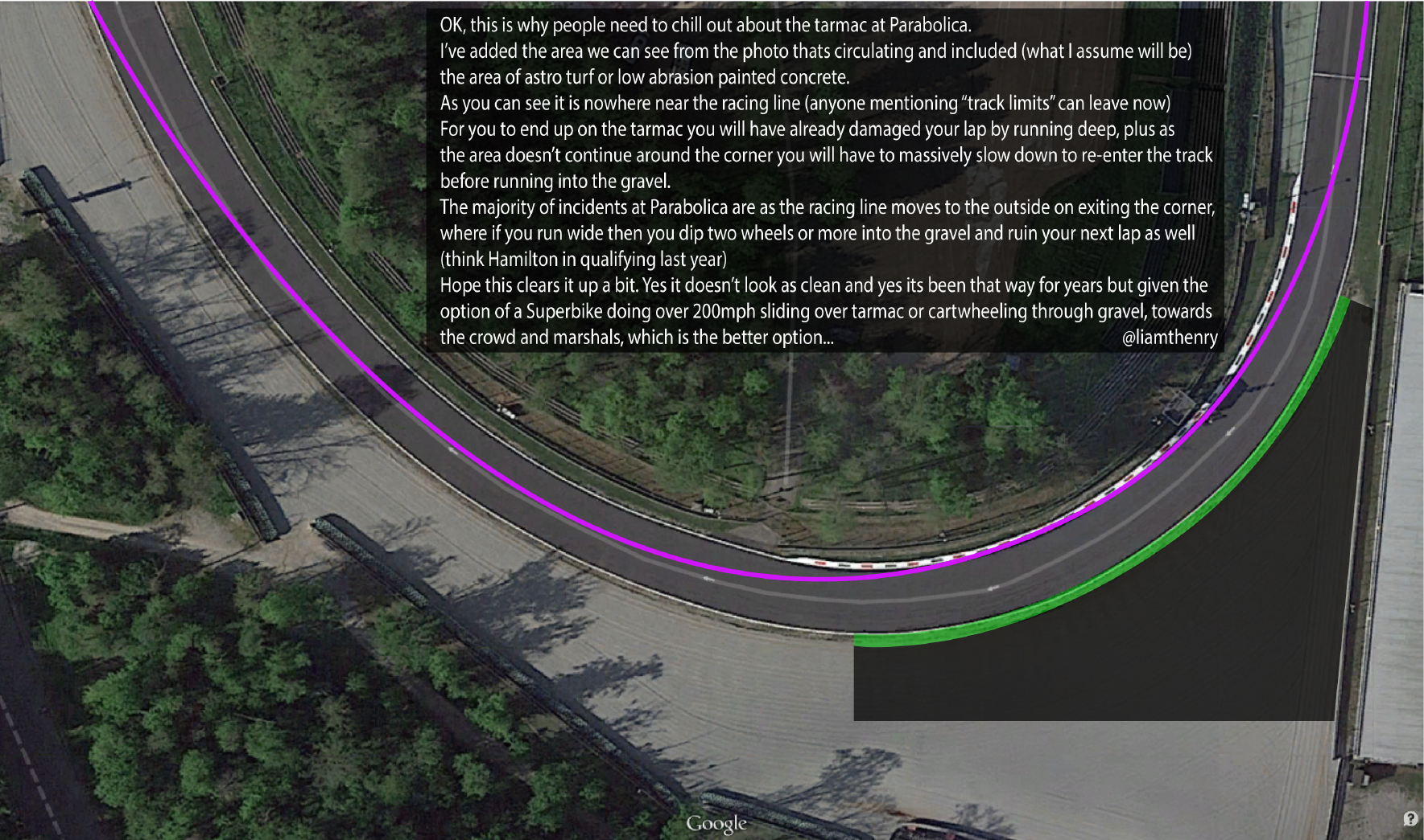 Myös se halutaan unohtaa, että juuri Parabolican kaltaiset pitkät ja nopeat mutkat ovat juuri niitä, joihin asfalttialueet kuuluvat. Niissä ulosajonopeudet ja -kulmat ovat kaikista vaarallisimmat ja hiekka sen vuoksi vaarallisin turva-aluemateriaali.