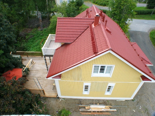Sain nostimen halvalla viikonlopuksi, että kykenin maalaamaan yläkerran päätykolmiot talosta. Harjapiikki kun on lähes yhdeksässä metrissä.