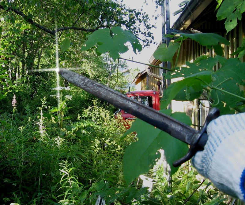 Kohta samaa hommaa tekemään. Aseena vesuri.Oli taas jättiläisukonputki tehnyt paluun ulkorakennuksen taakse, "Return of the Gianbt Hogweed". Poistin sen.