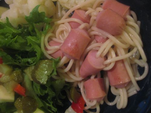 Sanoisinpa jopa aika fiksuksi ideaksi. Ja mielenkiintoiseksi. Sitä voisi joskus lähipiiriä kauhistuttaa moisella aterialla. *winks & wirn*Siinä oli oikeastaan useampikin idea. Eka oli se, että mä voin tehdä sitä yhdessä jälkikasvun kanssa. Toka oli se, että se saattais olla kyseisen jälkikasvun edustajan helpompi syödä, ku spagetti erikseen (joka on varsin sotkuista puuhaa). Ottaa vaan nakinpätkän haarukkaan, niin spagetit tulee ikäänku kylkiäisinä samaan osoitteeseen. Josta päästäänkin kolmanteen syyhyn, eli tuo jälkikasvun edustaja ei päässyt vetämään pelkkiä nakkeja naamariinsa, koska spagetit tulee väkisin mukana.