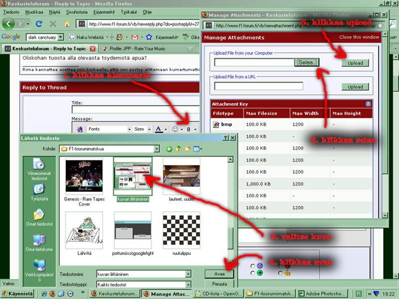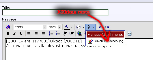Oliskohan tuosta alla olevasta opastustsydemistä apua? Kai nää systeemit kutakuinkin apaut samalta näyttää ja suurinpiirtein samalla lailla toimii eri koneilla ja selaimilla? Tollai oon ainakin saanut kuvat viesteihin liitettyä.Olkoot.