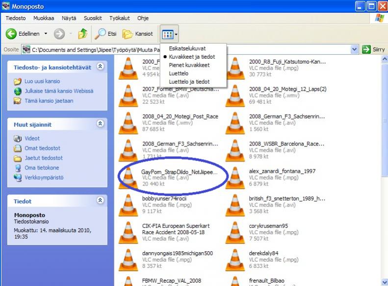 Oopee varmaankin tietäis mutta se taitaa olla aika kiireinen sen dildon kanssaMuistasko joku mistä XP:ssä sais pois sen ominaisuuden, että se tekee thumbnailit videoista ym. Explorer vie kaikki resurssit, kun yhtä rikkinäistä videota alkaa toi sahaamaan.